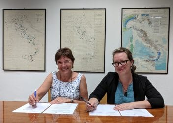 Dr. Maria Antonia Brovelli (Politecnico di Milano) who is Director of OSGeo and Patricia Solís, PhD (Arizona State University) who is CoFounder and Director of YouthMappers, sign the MOU on campus in Milan, Italy, on July 25, 2018